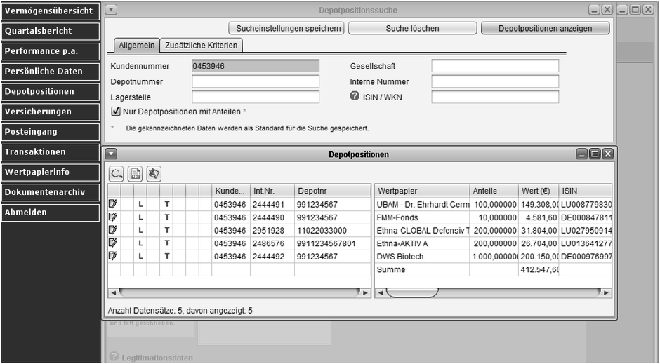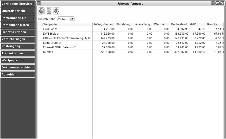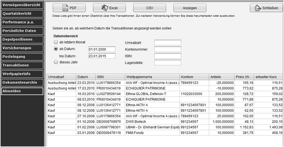 Sie wünschen sich einen schnellen Überblick über die Performance einzelner Anlagen in Investmentfonds, Aktien oder festverzinslichen Wertpapieren? Mit dem Kundenservicecenter können Sie jederzeit und bequem alle Anlagen auf einen Blick vergleichen und den Beitrag der Einzelpositionen zum Gesamtergebnis betrachten – unabhängig von Depotlagerstelle und zeitlich unbegrenzt über die gesamte Haltedauer Ihrer Positionen.