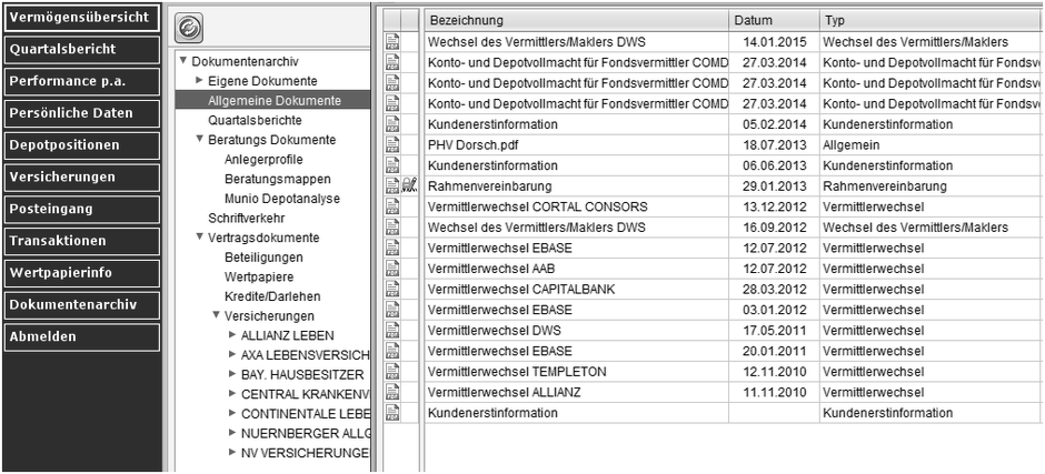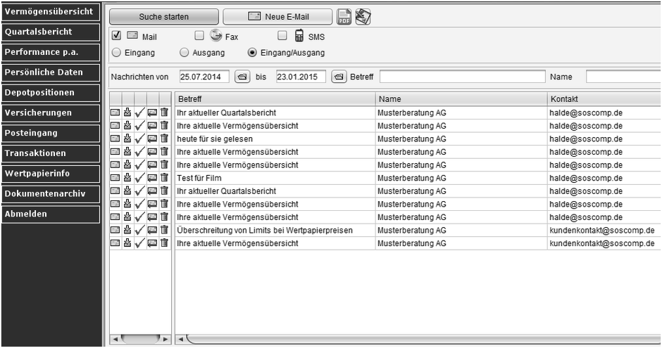Ihr Kundenservicecenter ermöglicht Ihnen den schnellen Zugriff zu sämtlicher Korrespondenz via Email, SMS oder Fax mit Ihrem Finanzberater. Archivieren Sie somit wichtige Informationen und Gesprächsnotizen bequem und rechtssicher innerhalb Ihres Kundenzugangs. Finden Sie schnell relevante Informationen und sparen Sie sich das Suchen in externen Email-Programmen oder Ihrem Versicherungsordner.
