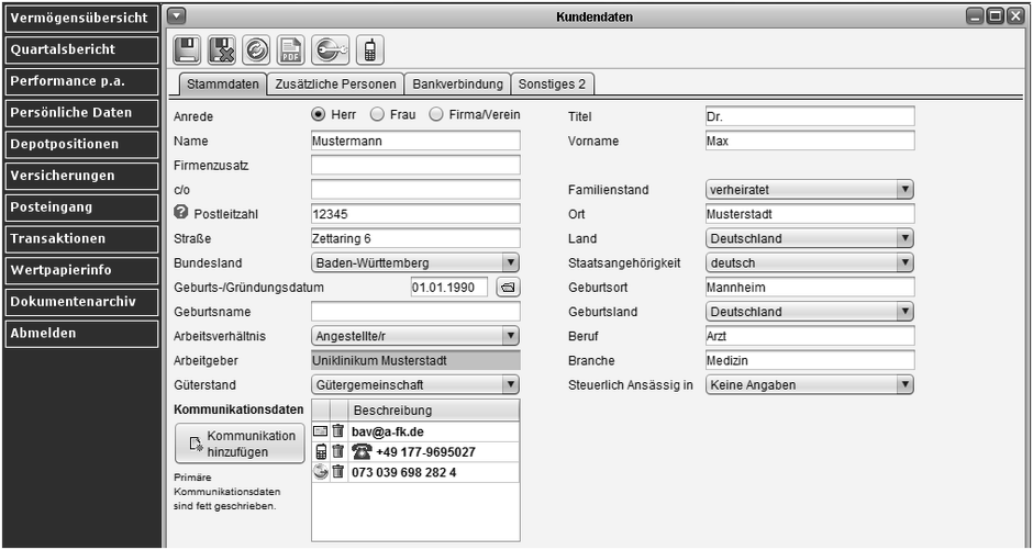 Hinterlegen, ändern und ergänzen Sie in Depotblick Ihre persönlichen Stammdaten oder die Ihres Unternehmens und erleichtern Sie somit die Zusammenarbeit mit Ihren Vertragspartnern und Ihrem Finanzberater. Definieren Sie Ihre weitere Personen in Ihrem Haushaltsverbund und konsolidieren Sie somit die Vermögensübersicht zu Ihrer ganzen Familie. Nie war es für Sie leichter, Ihr Vermögen zu übersichtlich und einfach zu verwalten!