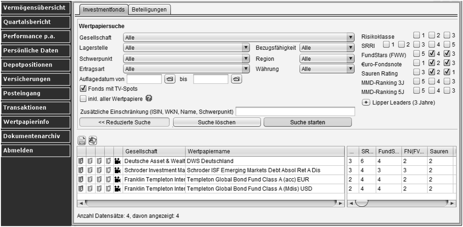 Mit der Wertpapierinformation haben Sie Zugriff auf Fondsdaten von über 18.000 in Deutschland zum Vertrieb zugelassenen Investmentfonds und Beteiligungen. Selektieren Sie mit vielfältigen Optionen die besten Fonds einer Anlagekategorie, greifen Sie auf alle relevanten Fondsdokumente zurück (Fondsinformation, Factsheet, KID) und nutzen Sie zahlreiche Filme der Fondsgesellschaften zur professionellen Information.