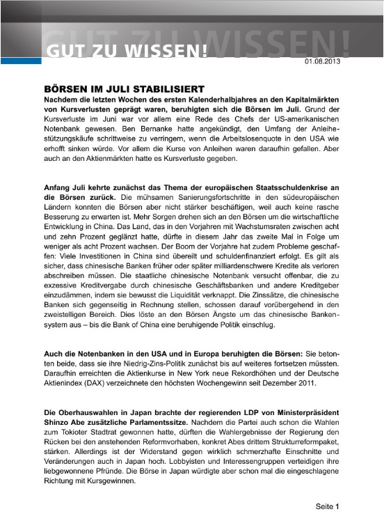 Es reicht nicht aus, sich einmal über seinen Vermögensaufbau Gedanken zu machen und dann alles dem Zufall zu überlassen. Ihr Vermögen benötigt eine dauerhafte Betreuung. Transparenz und Information bei veränderten Marktentwicklungen haben für uns und unsere Kunden Priorität. Deswegen informieren wir Sie monatlich, quartalsweise oder individuell über die Entwicklung Ihres Vermögens und den Stand Ihrer Verträge. Darüber hinaus haben Sie 24/7 Zugriff auf Ihre Daten und Dokumente via Internet und App.